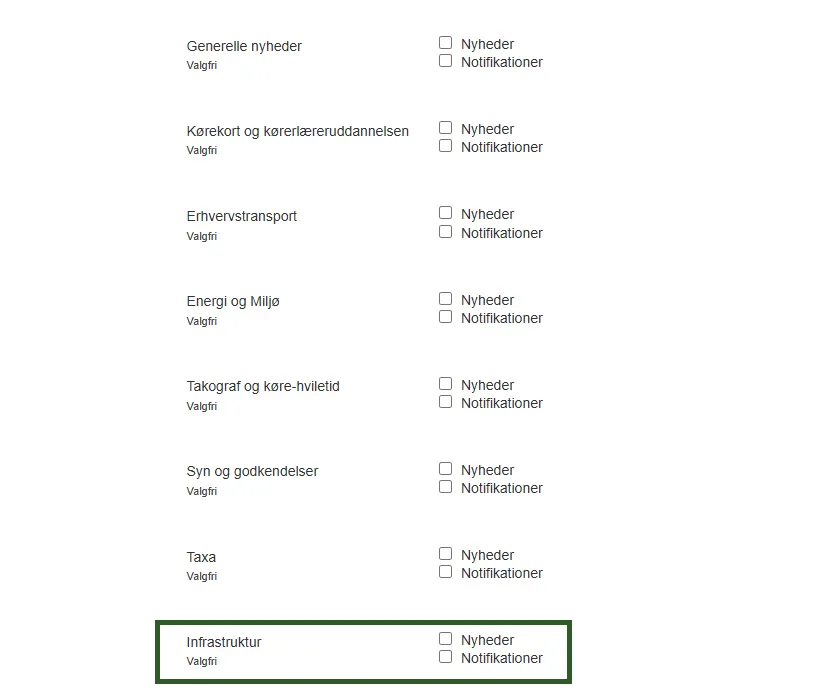 For at modtage nyheder vedrørende infrastruktur og drivmidler skal du vælge punktet "Infrastruktur" nederst på siden i linket.