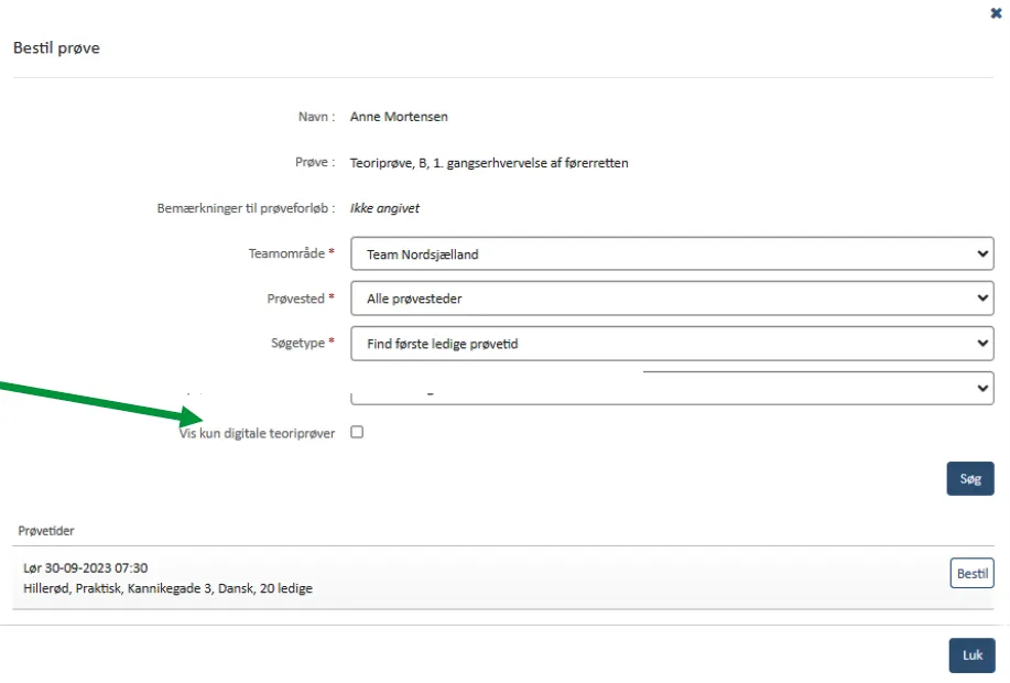 3. Skal du booke en digital teoriprøve, er det her vigtigt, at du husker at sætte flueben ved ”Vis kun digitale teoriprøver”.