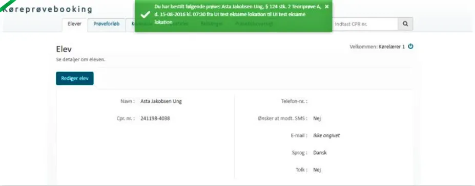 Eleven kan se sit resultat i koreprovebooking.dk under sin sag.