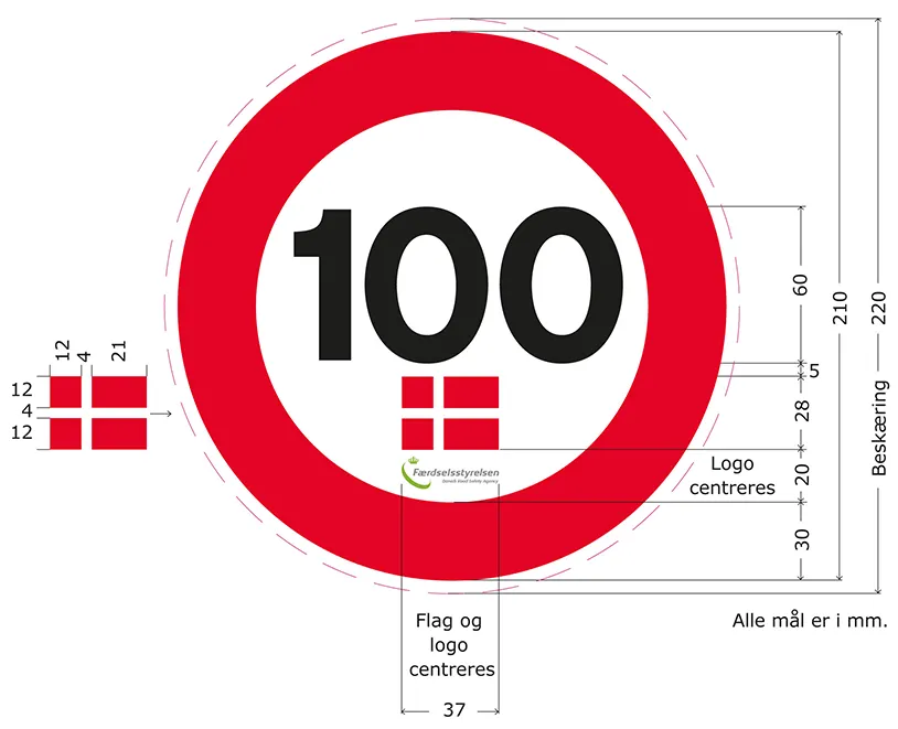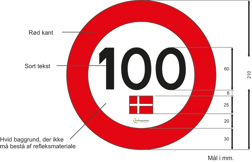 Det danske Tempo 100-mærke skal være udformet i overensstemmelse med kravene. Efter den 31. december 2016 må køretøjer dog ikke forsynes med mærker, der er udformet med det ældre design.